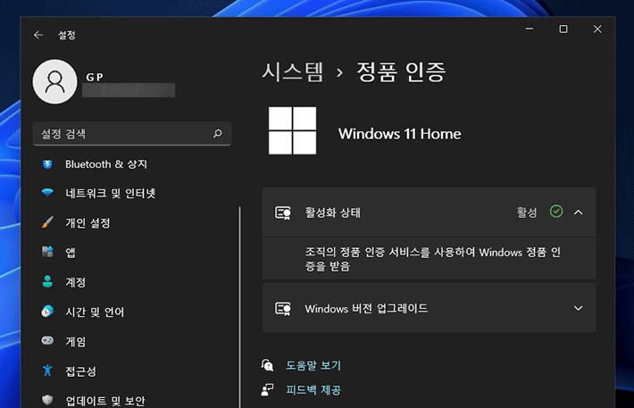 윈도우 설정 > 시스템 > 정품 인증 화면으로 이동해 Windows 11 에디션 정보 화면에서 정품 활성화 상태를 확인합니다.